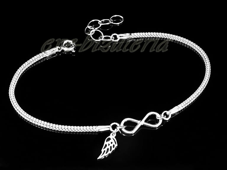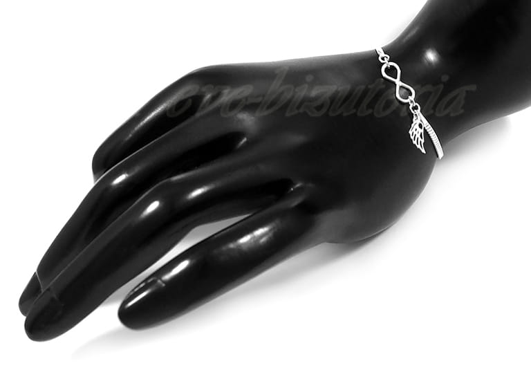 Bransoletka ze srebra próby 925 z centralnym motywem w postaci modnego znaku nieskończoności oraz zawieszki w skrzydła Anioła. Wygodny w noszeniu łańcuszek o splocie typu lisi ogon posiada oczkową regulacją długości.
