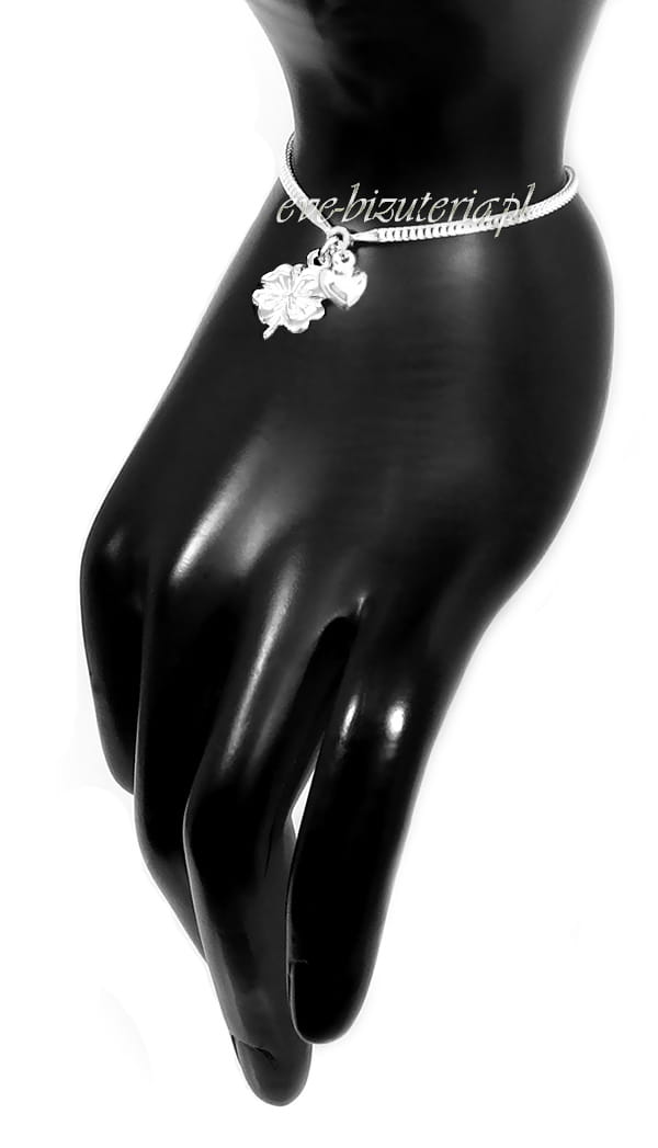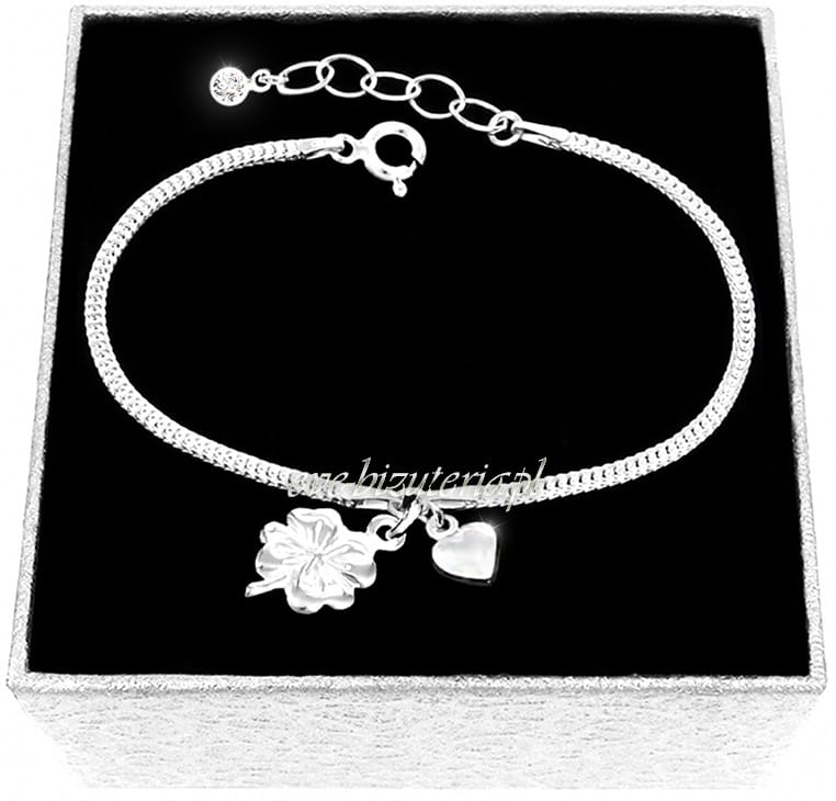 Piękna bransoletka z zawieszkami w kształcie czterolistnej koniczynki oraz wypukłego, gładko polerowanego serduszka. Bransoletka posiada bardzo wygodny splot łańcuszka typu Lisi Ogon z oczkową regulacją długości zdobioną ną na końcu splotu zawieszką z cyrkonii koloru białego o diamentowym szlifie.