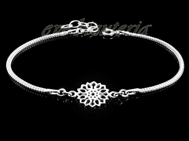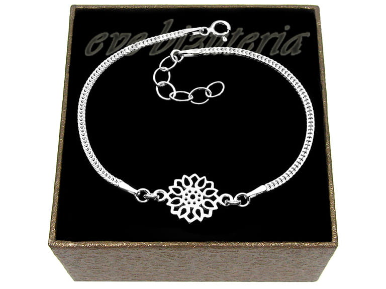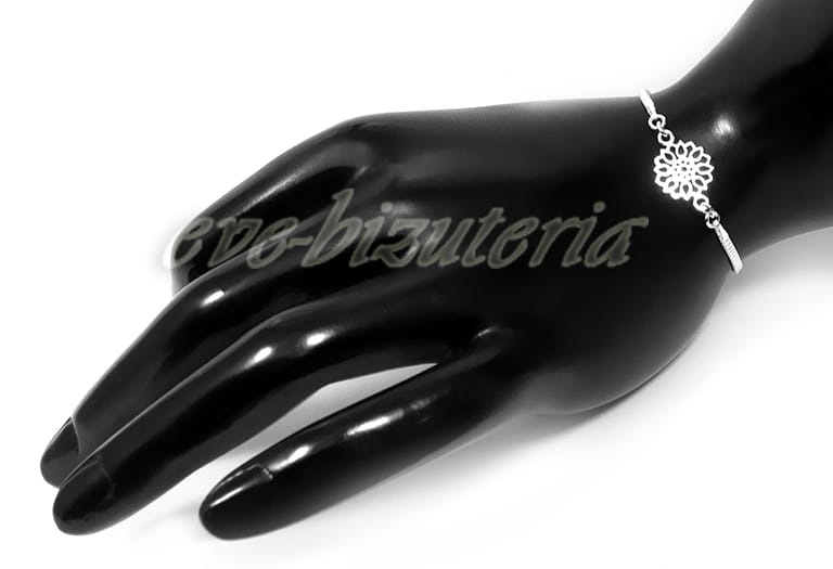 Bransoletka z wysokiej próby srebra 925 z zawieszką w kształcie Kwiatuszka. Wygodny w noszeniu łańcuszek bransoletki o splocie Lisi Ogon posiada oczkową, precyzyjną regulację długości. Zakupioną bransoletkę otrzymasz w pudełeczku jubilerskim. Polski producent. Polecamy.